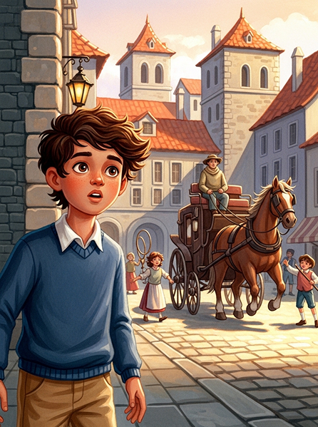 Leo watched a grand horse-drawn carriage rumble past, the horses' manes braided with silk ribbons. Children played with wooden hoops, their laughter echoing against the brick walls. No one noticed his modern clothes; he was just another curious boy. He felt like a guest in a living story, witnessing a world from long ago. The marketplace was a symphony of sounds—shouting vendors, clinking coins, and the rhythmic tapping of a blacksmith’s hammer.