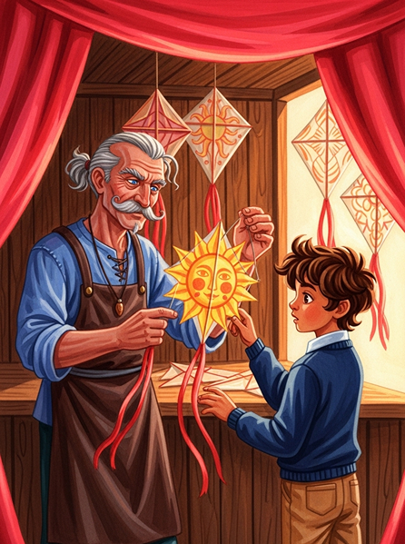 Leo watched as Silas glued a flowing tail of rainbow ribbons to a sun-shaped kite. Every movement was slow and intentional. In this world, nothing seemed to be in a rush. There was a quiet dignity in the way Silas crafted his art, valuing beauty over speed. He showed Leo how to balance the frame, explaining that a kite needed both strength and lightness. Leo felt a deep, warm spark of wonder.