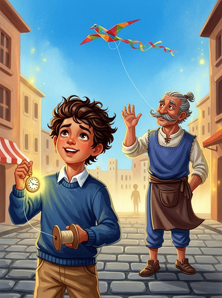 Silas handed a wooden spool to Leo. For a moment, Leo felt the steady pull of the wind as a paper bird soared high above the market. It danced against a sky so blue it looked painted. But then, the pocket watch began to vibrate. The vibrant colors of the market started to soften. Silas waved a hand in farewell, his smile remaining clear even as the image of the marketplace began to blur away.